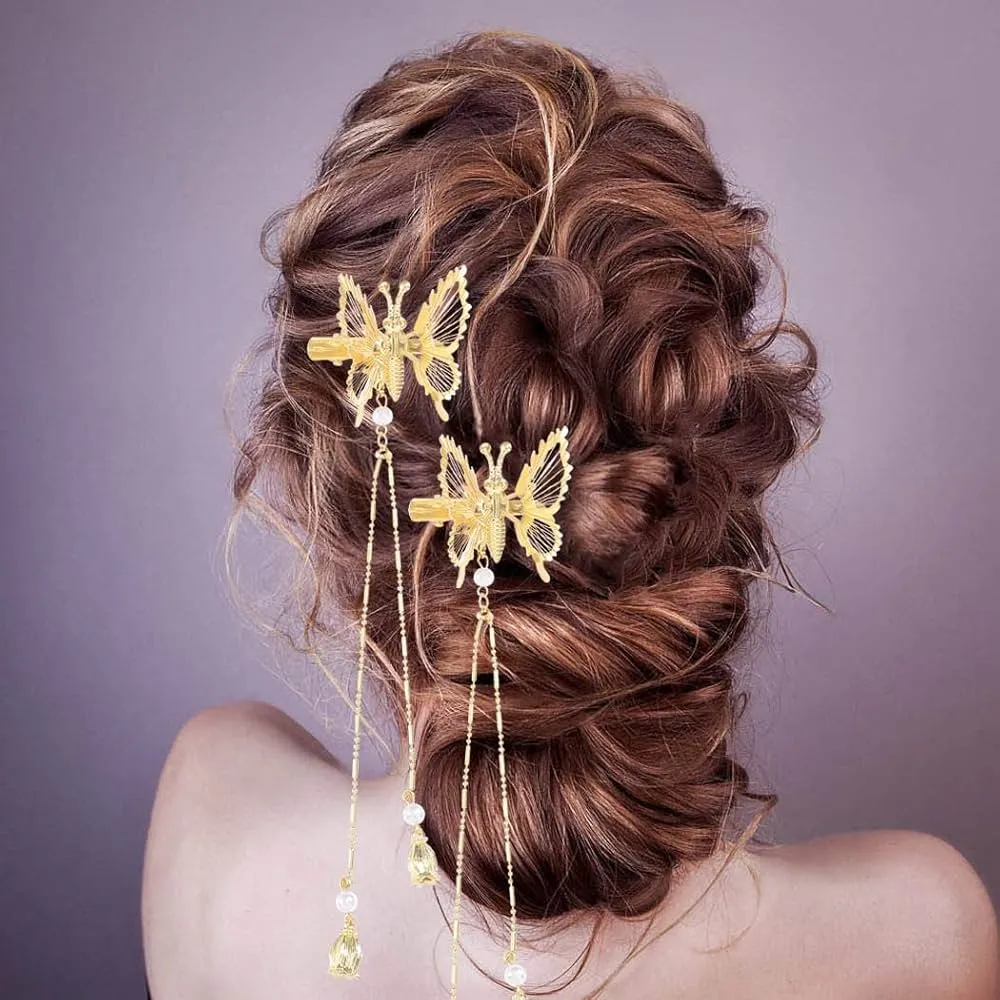 2pcs Elegant Tassel Butterfly Hairpin, Metal Tassel Long Hair Clip, Touching Butterfly Clips, Antique Side Clip, Girls Shiny Hair Clip(Gold)