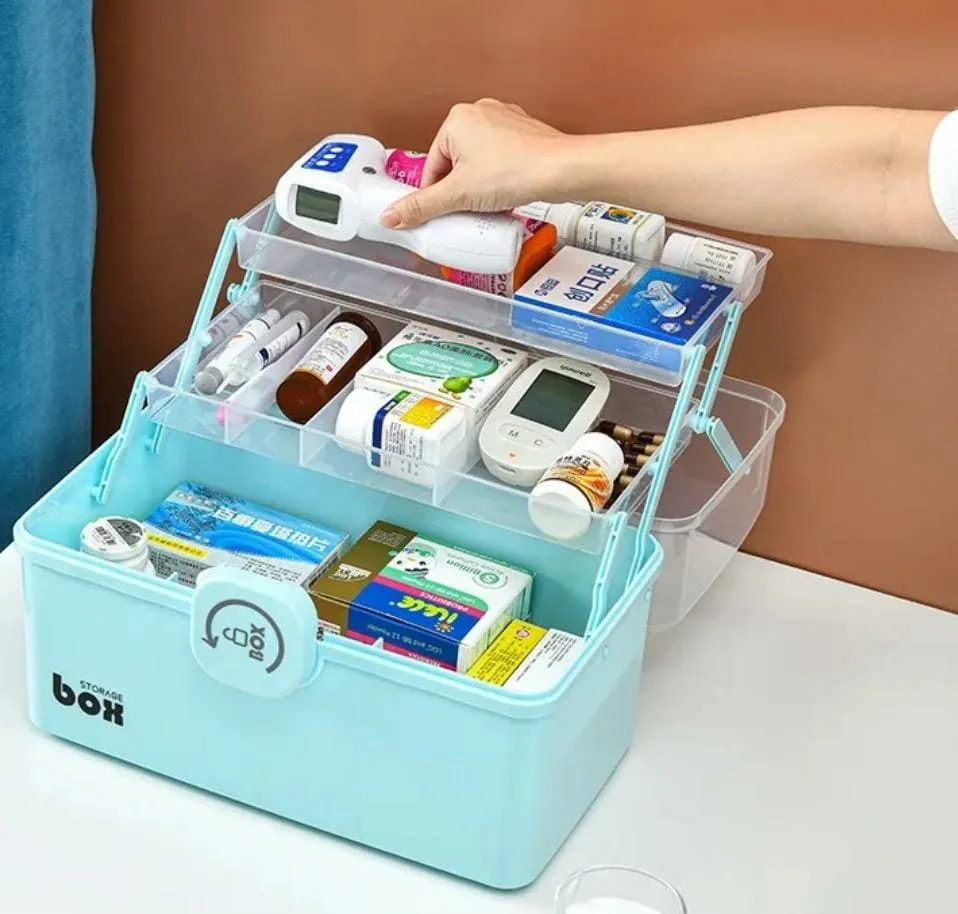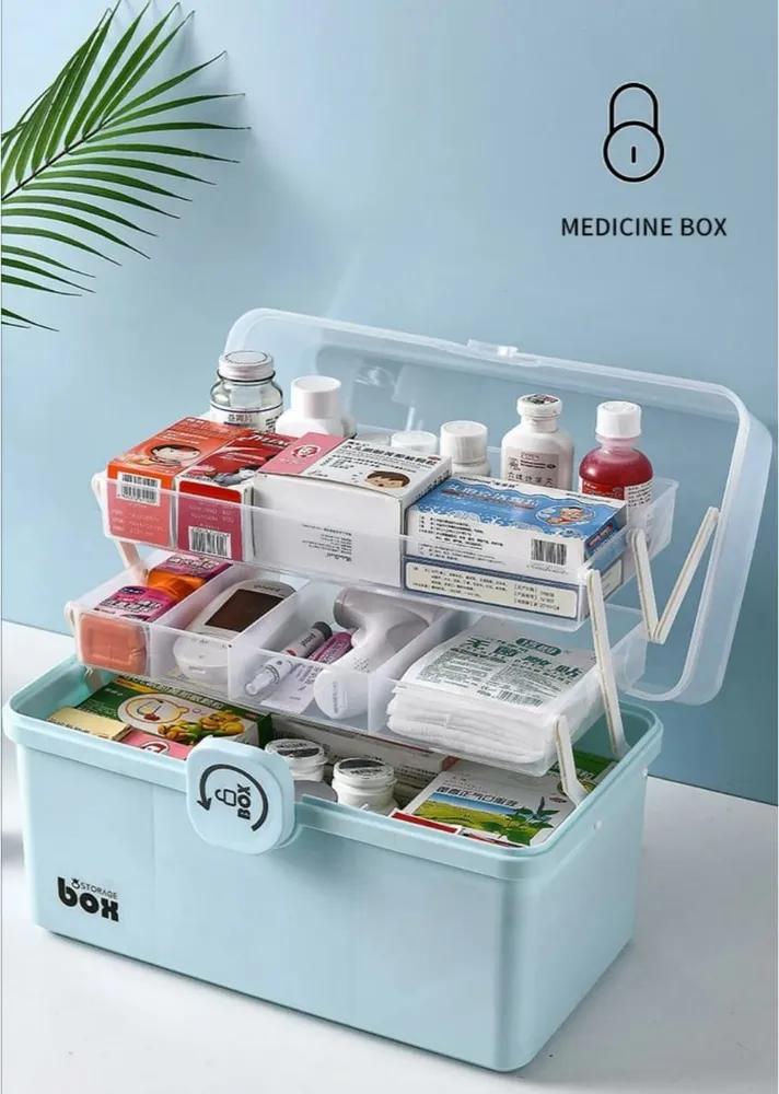 Medicine Box, 3 Levels, First Aid Box, Portable Folding Storage Organiser Box, Lockable Medicine Cabinet, Plastic Medicine Box (Blue, 34x19x21.5 cm)