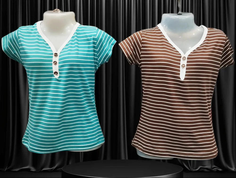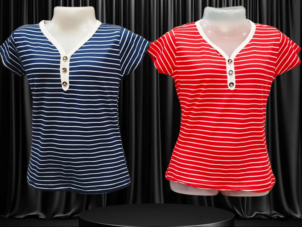 Kids Casual Cotton T- Shirts, Nack Button Short Sleeve Horizonatal White Stripes. T Shits