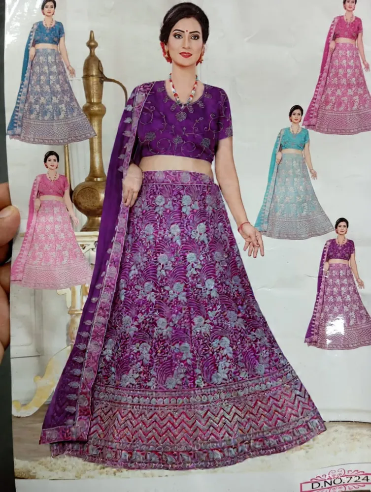 Purple bridal lehenga material with silver sequins and patterned thread work. Description Colour : Purple Work : Stone , Beads & Thread work Quality Net Material Adding a touch of l... Read More