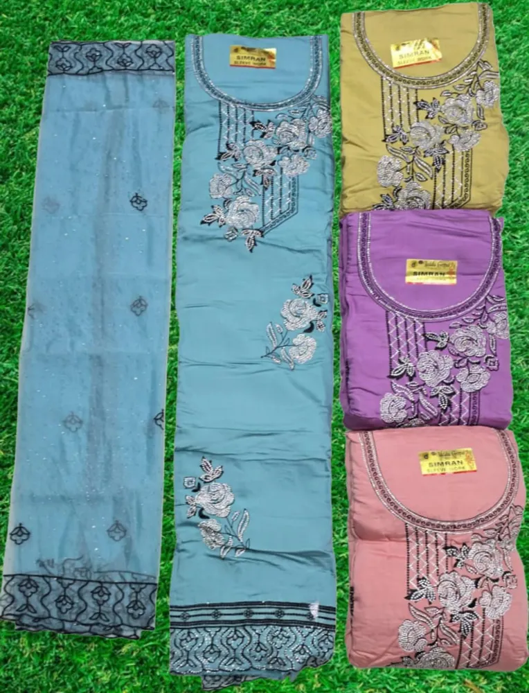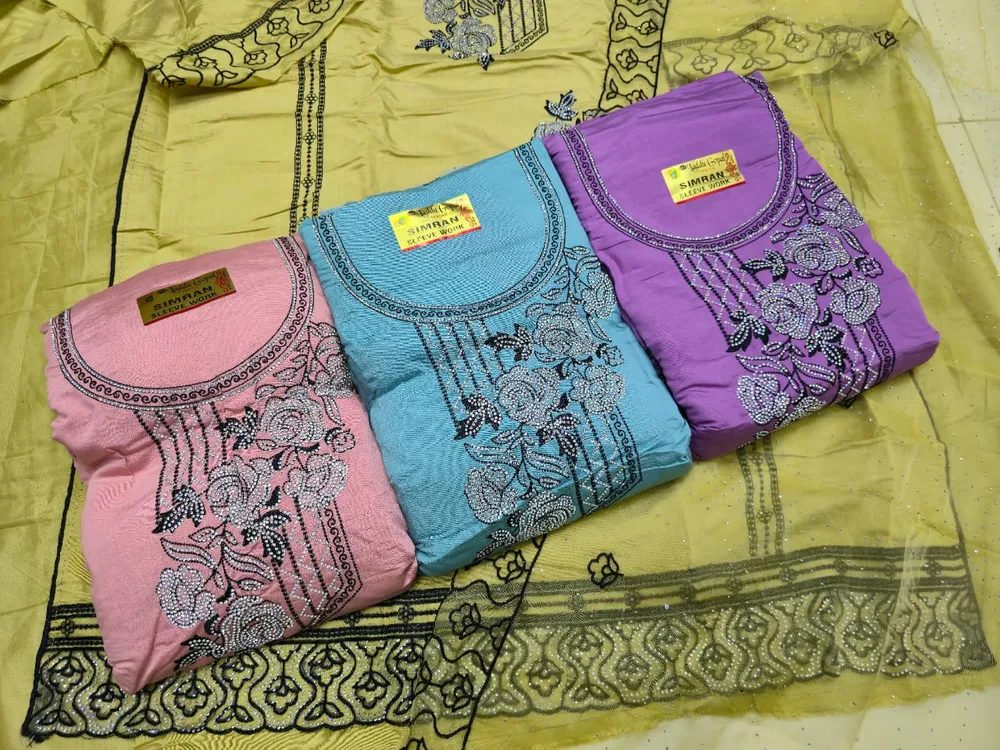 3PCS High Quality Shalwar Material Available Stone & sequence work Roman silk shalwar material and Plain Bottom, Dupatta available