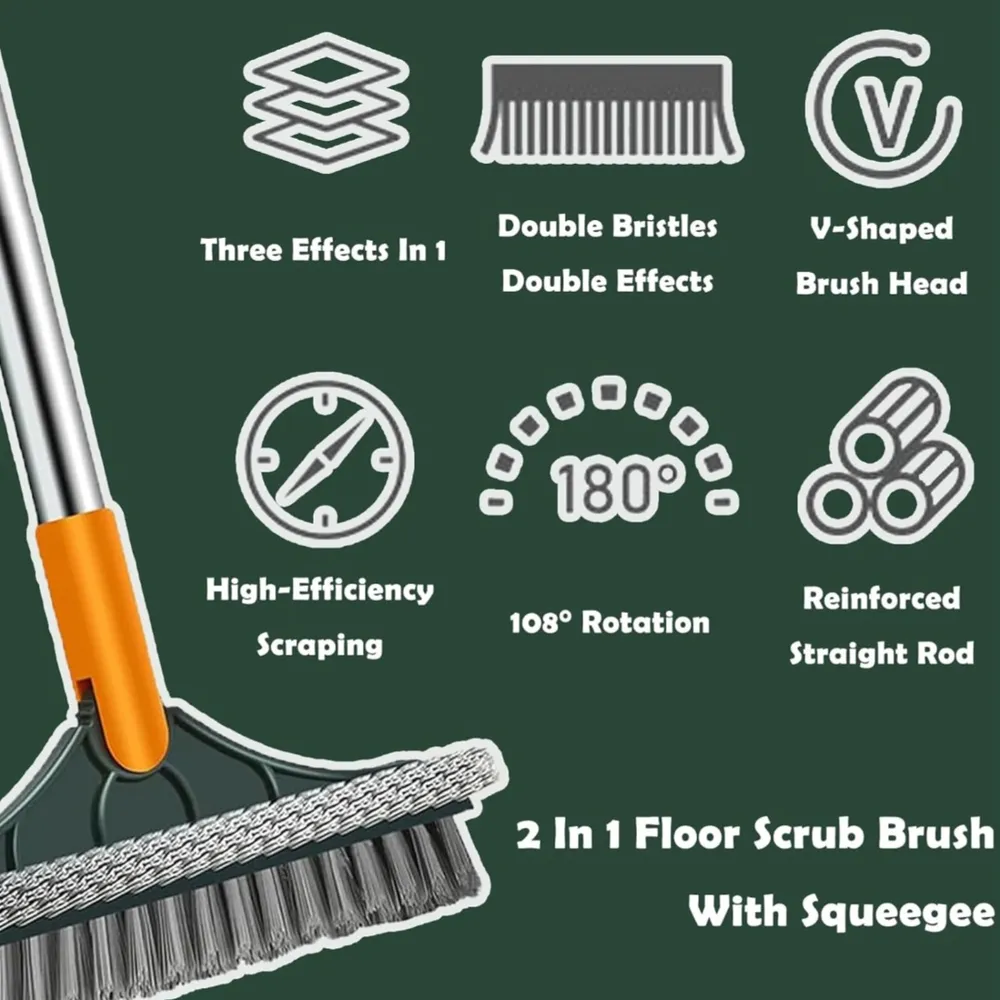 3 in 1 Floor Scrub Brush with Squeegee, 120°Rotating Removable V-Shaped Soft Floor Brush