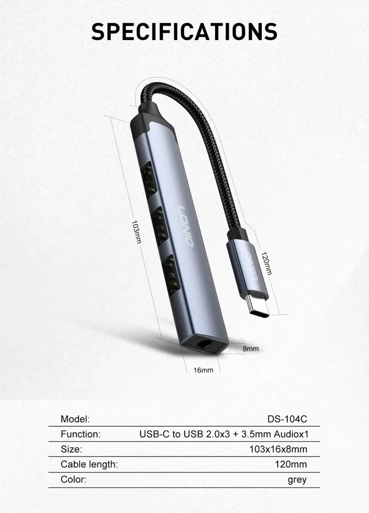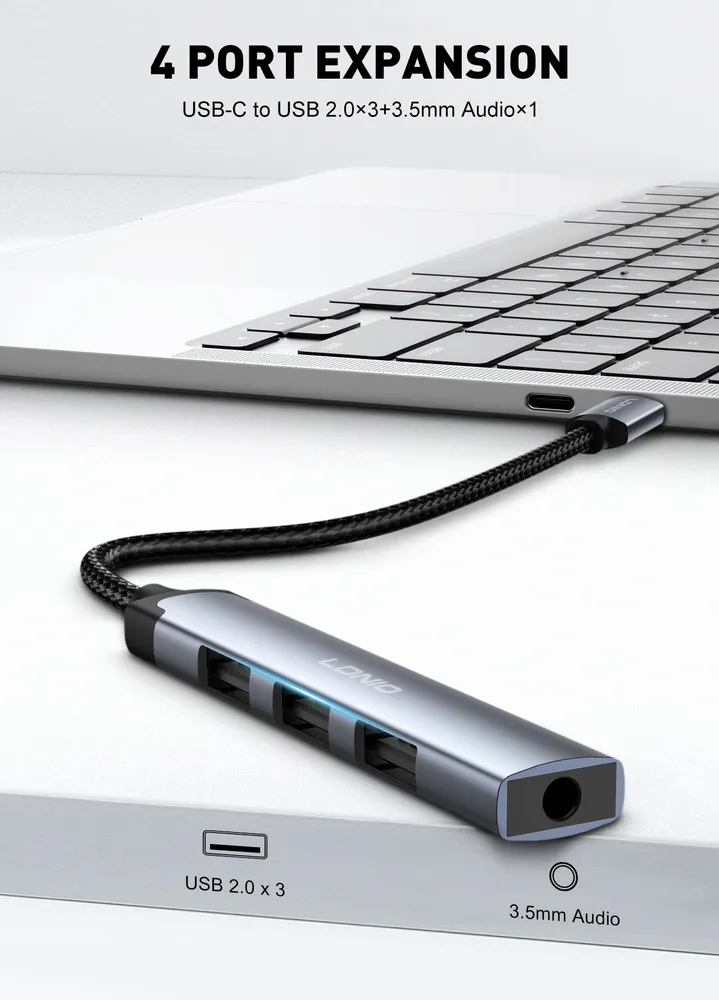 LDNIO DS-104C USB-C 4-IN-1 Hub | USB-C to 3x USB 2.0 + 3.5mm Audio Adapter