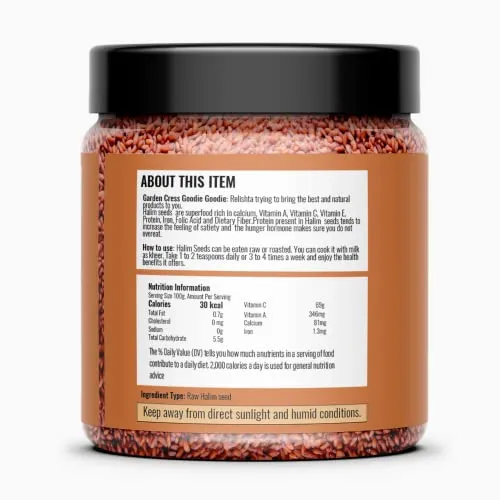 About this item 100% Vegetarian Product of India Halim seeds are incredibly filling and provide satiety. Being an excellent source of fibre, they take longer to digest and thus reduce overeati... Read More
