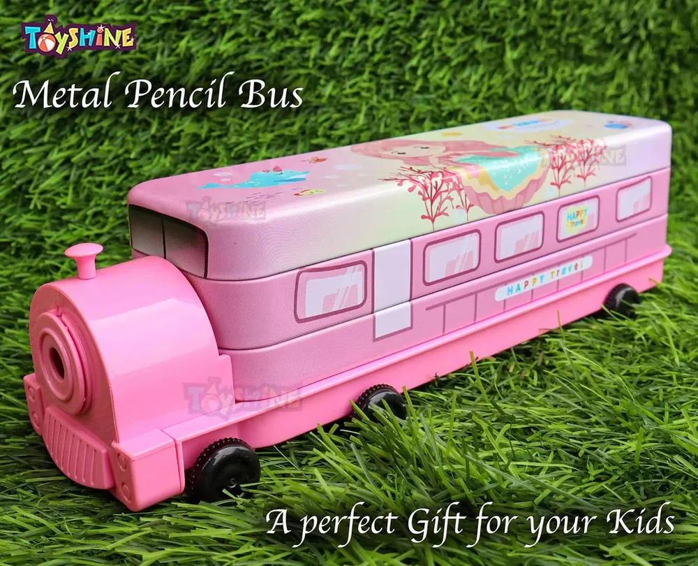 Toyshine Cartoon Printed Train Metal Pencil Box with Moving Tyres and Sharpner for Kids - Pink
