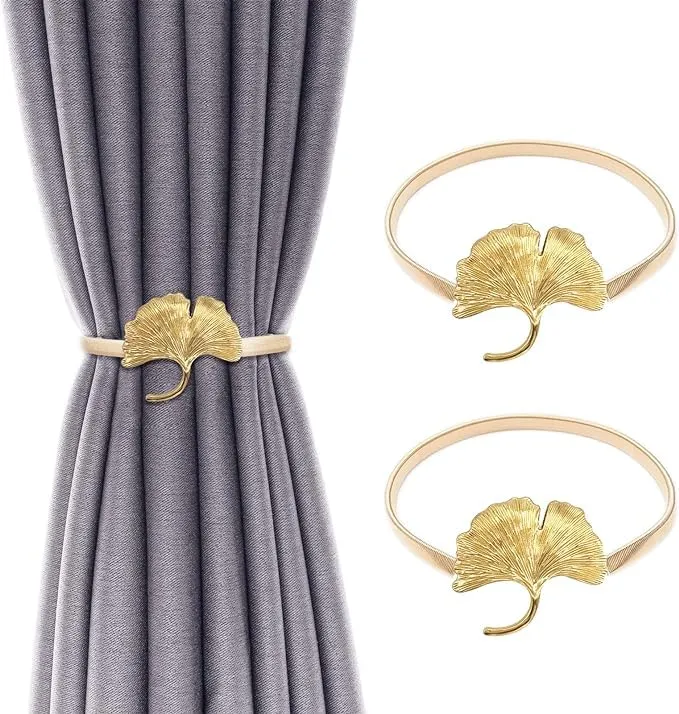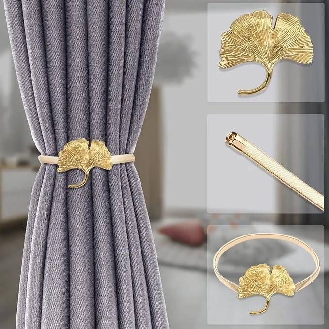 Trexee 2 Pcs Gold Ginkgo Curtain Tiebacks Aluminium Alloy Adjustable Spring Design Curtain Holdback Curtain Ties for Drapes Curtain Holder Carving Des