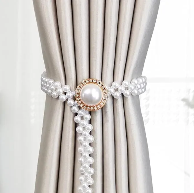 Trexee 2 Pcs Gold Pearl Round Curtain Tiebacks Elastic Holder Hook Buckle Clip Pretty Adjustable Curtain Holdback Curtain Ties for Drapes Curtain Hold