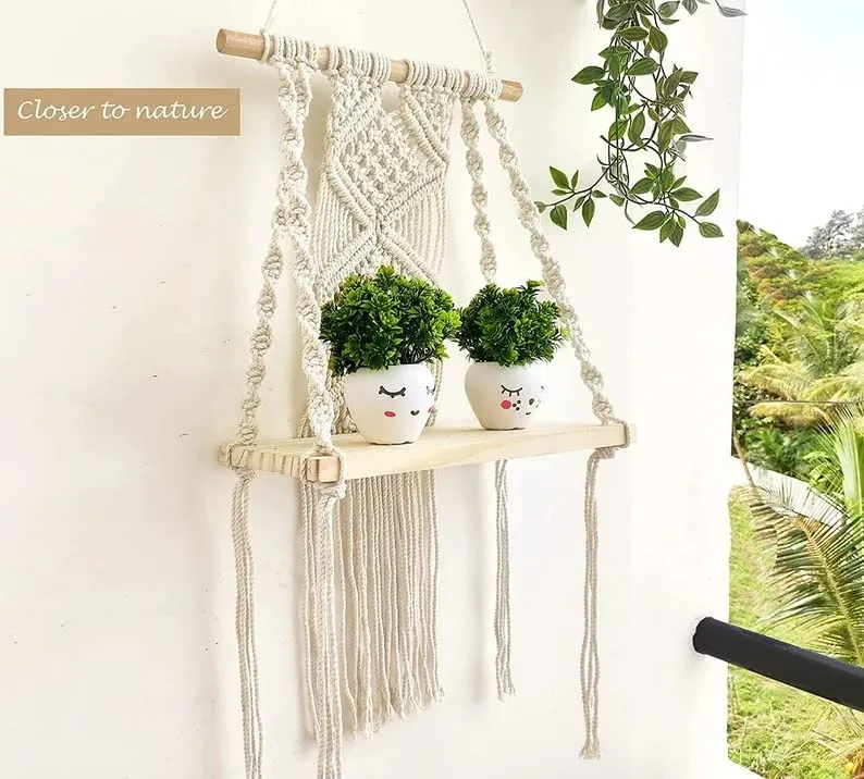 Urooz Macramé Wooden Wall Hanging Shelf |940| Modern Chic Woven Macrame Tapestries, Wall Art Home Decor for Apartment, Dorm, Bedroom, Living Room, 12"