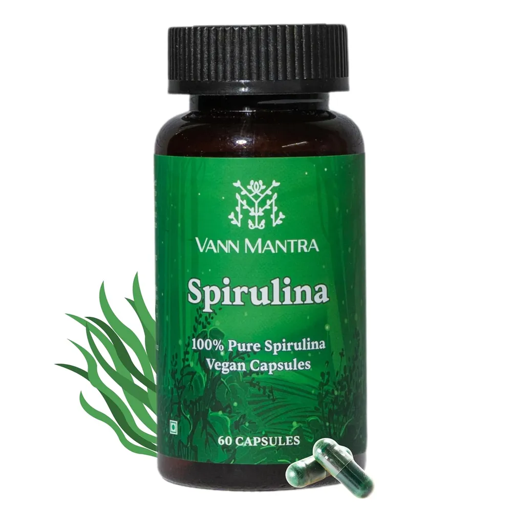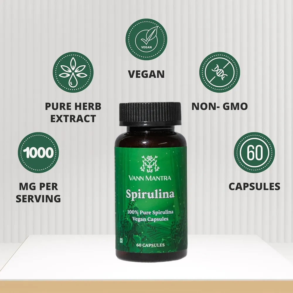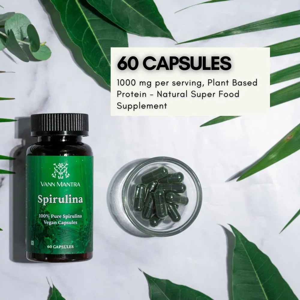 VANN MANTRA Spirulina 60 Capsules (500mg) - High Protein Natural Super Food Supplement for Men & Women, Blue-green Algae Plant Based Arthrospira Capsu