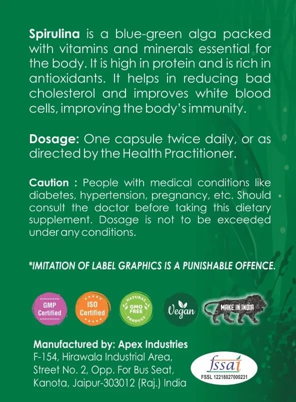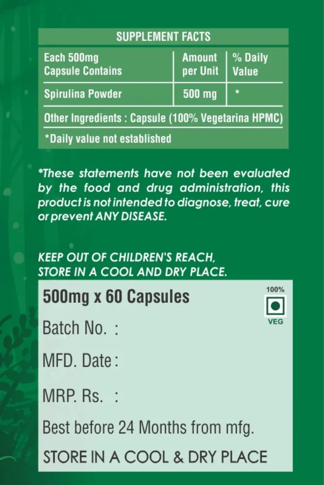 About this item SPIRULINA CAPSULE SPECIFICATION: Each bottle contains 60 capsules with 500 mg of each, pure and organic spirulina. Our spirulina capsules are free from additives, fillers, and ar... Read More