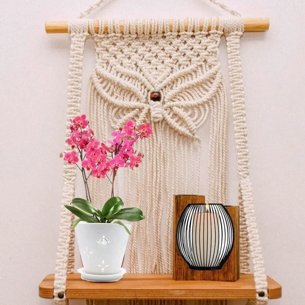 tms Macrame Wall Hanging Shelf | Wood Floating Hanging Shelf Storage Shelf Bohomian Wall Décor (Size 12x 5 x 24 Inches) 1 Pcs, Off-White