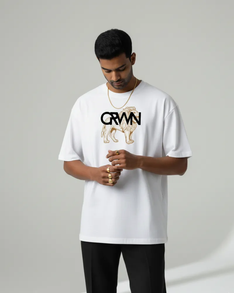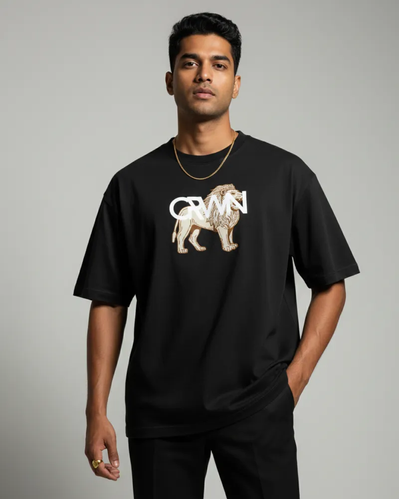CRWN Oversized T-Shirt for Men – Gold Lion Logo Front Print (Black, White & Navy Blue)