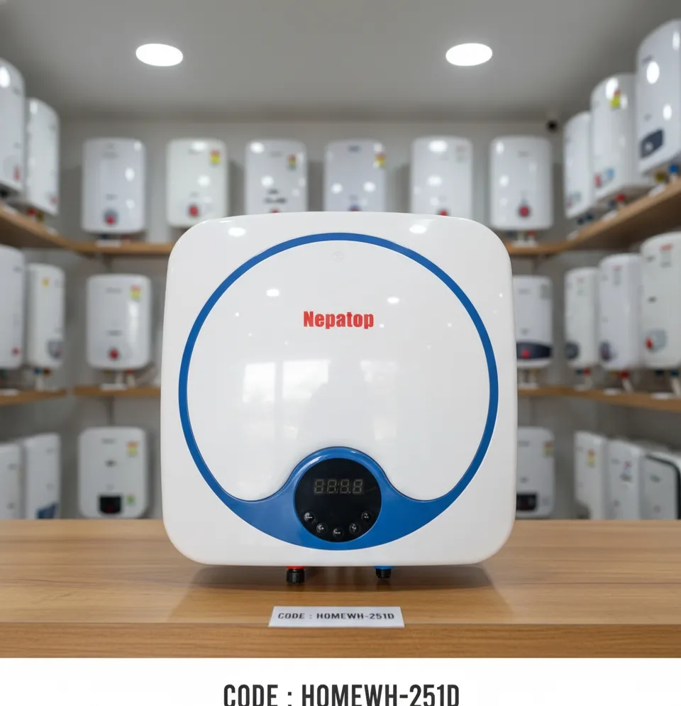 NEPATOP WATER GEYZER 500x485x435MM EWH-251D Code : HOMEWH-251D Material : Plastic Color and Surface : White Features : Multiple safety systems, Suitable for high-rise buildings.