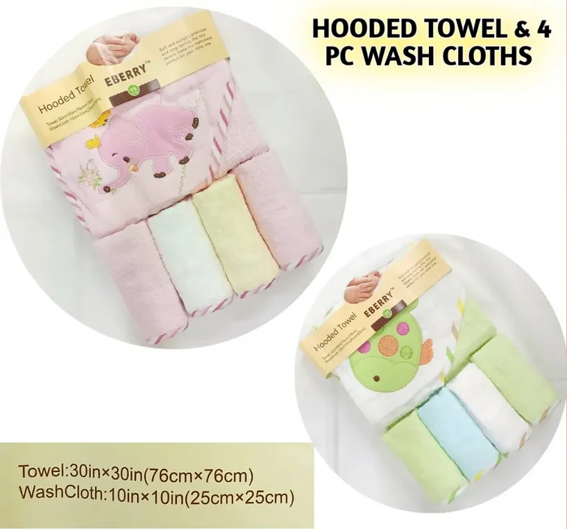 This product is a "Hooded Towel & 4 PC Wash Cloths" set from the brand Eberry. The set includes a hooded towel and four washcloths, featuring a variety of cute animal designs. It is desi... Read More