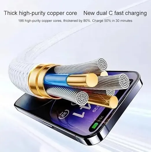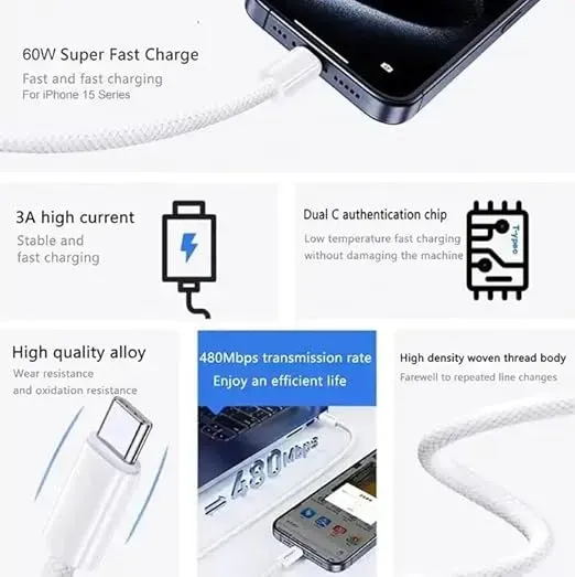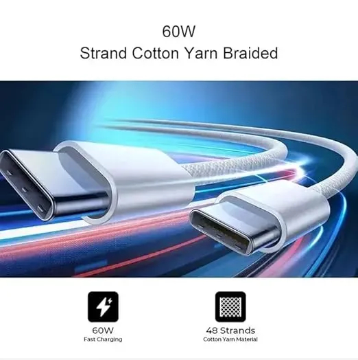 60W USB-C to USB-C Fast Charging Cable for iPhone – PD Power Delivery, High-Speed Data Transfer, Braided & Durable Charger Cord