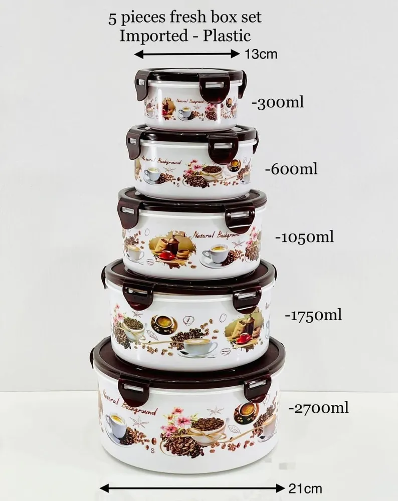 5 pieces fresh box set Imported - Plastic, small one length 13cm,large one is 21cm -300ml, -600ml, -1050ml,-1750ml,-2700ml.