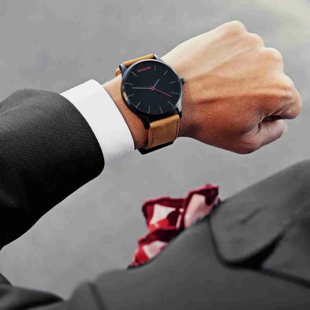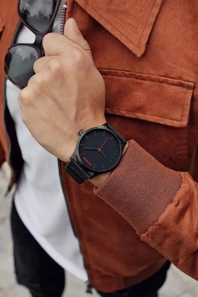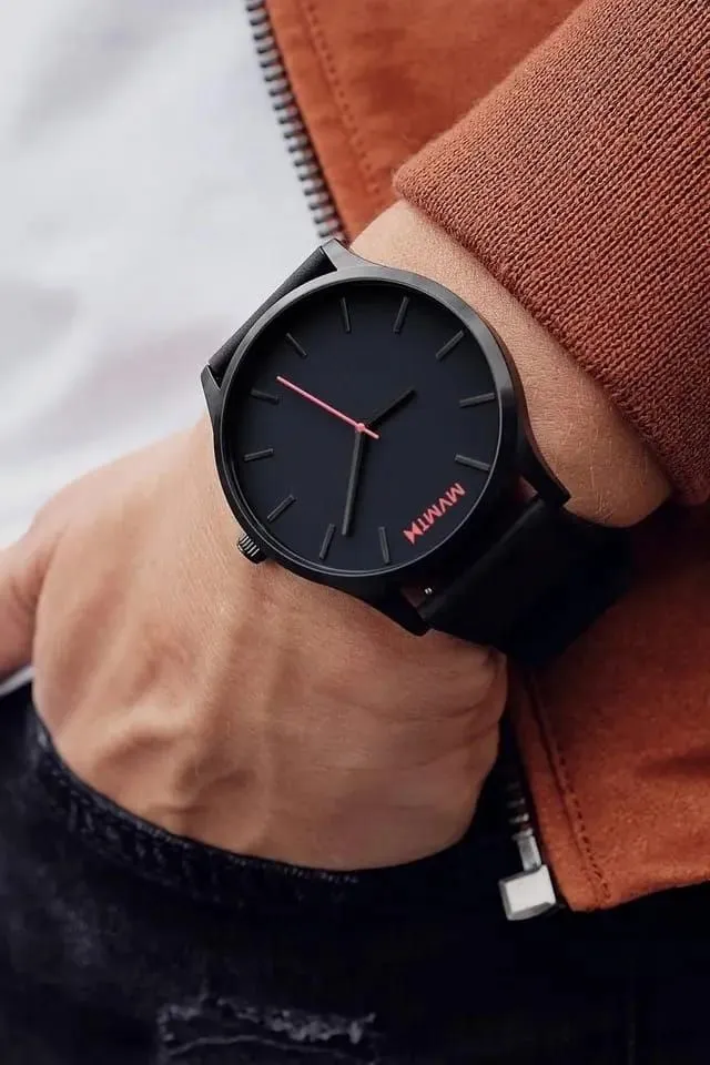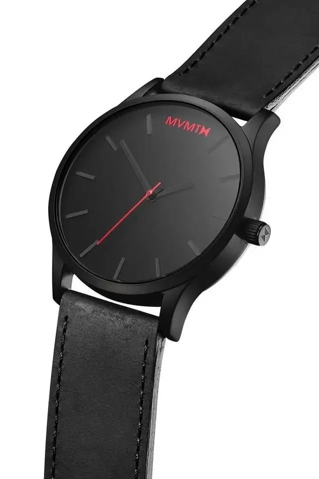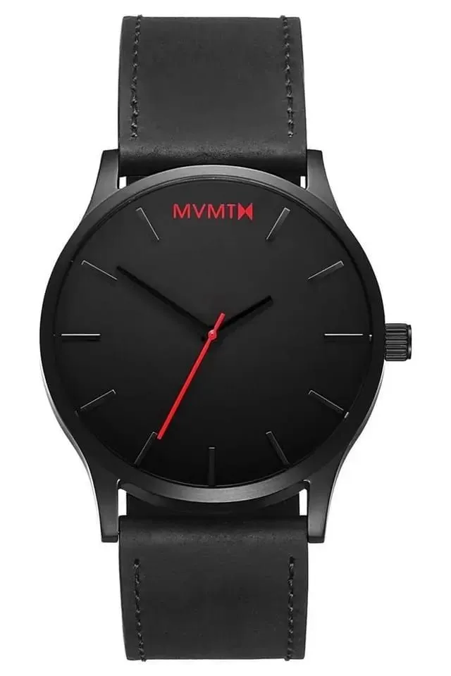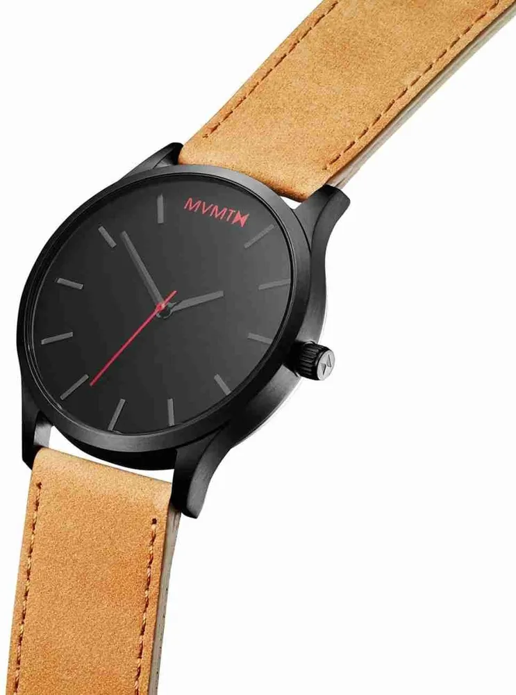 Men's watch MVMT collection ClassicBlack. MM01-BBRGL. 45mm (9mm high) black brushed steel case. Black dial ; Mineral glass. Black & Brown leather stra