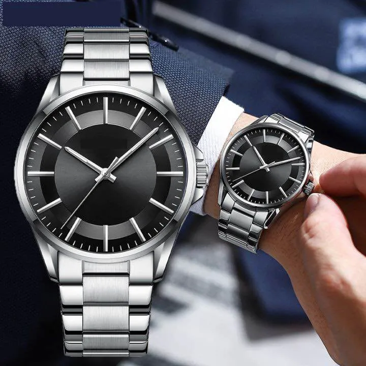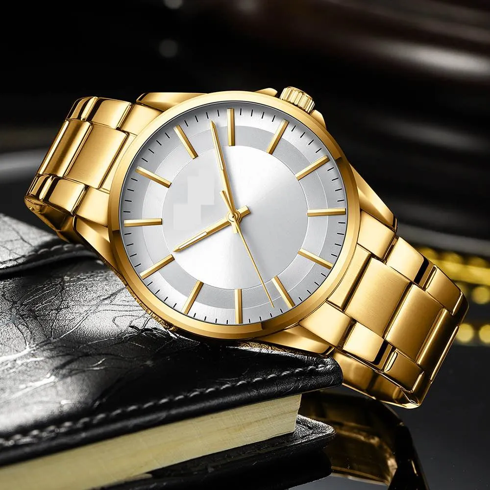 Stainless Steel Luxury Men Watch Quartz Analog Business Chain Casual Wrist Dial Watches For Boys and Gents Black White Silver Gold