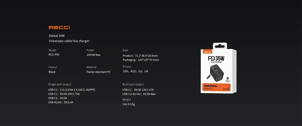 Recci RCG-P06 PD 35W Universal Fast Charger Black
