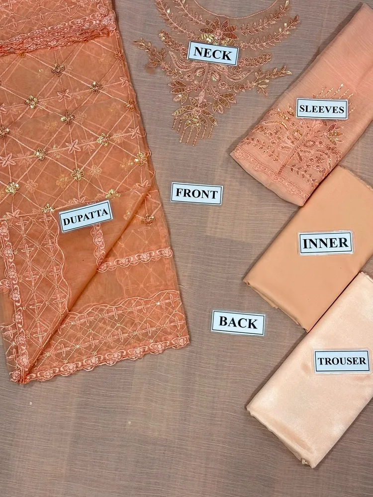 Gracia Collection Embroidered Peach Formal Suit Gracia Collection, Peach Formal Suit, Embroidered Women’s Dress, Pakistani Formal Wear, Chiffon Suit,