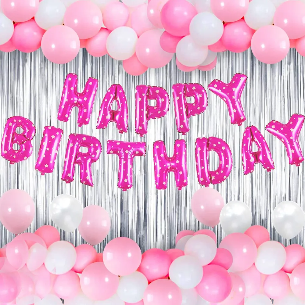 Product details of Birthday Decoration set Pink Happy birthday Foil Banner Pink 60 pcs balloons (15 Dark Pink, 25 Light Pink, 20 White) 2Pcs Foil Curtain Silver Garland... Read More