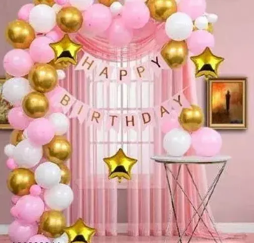 Product details of Birthday Decoration set Pink with Stars 4pcs Foil Star Gold Happy birthday Flag Banner Pink 40 pcs balloons (10 Metallic Chrome Gold, 20 Light Pin... Read More