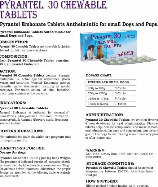 Pyrantel Chewable Tablets for Cats, Kittens, Small Dogs & Puppies – Anthelmintic Dewormer (10 Tablets, 30mg)