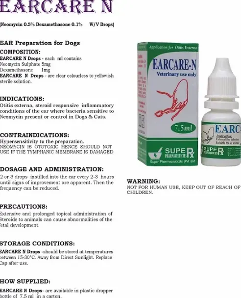 Earcare-N for Pets Dogs Cats and Other Small Animals 7.5ml Neomycin Eye/ ear drops for small animals. Otitis externa, steroid responsive inflammatory conditions of the ear where bacteria sensi... Read More
