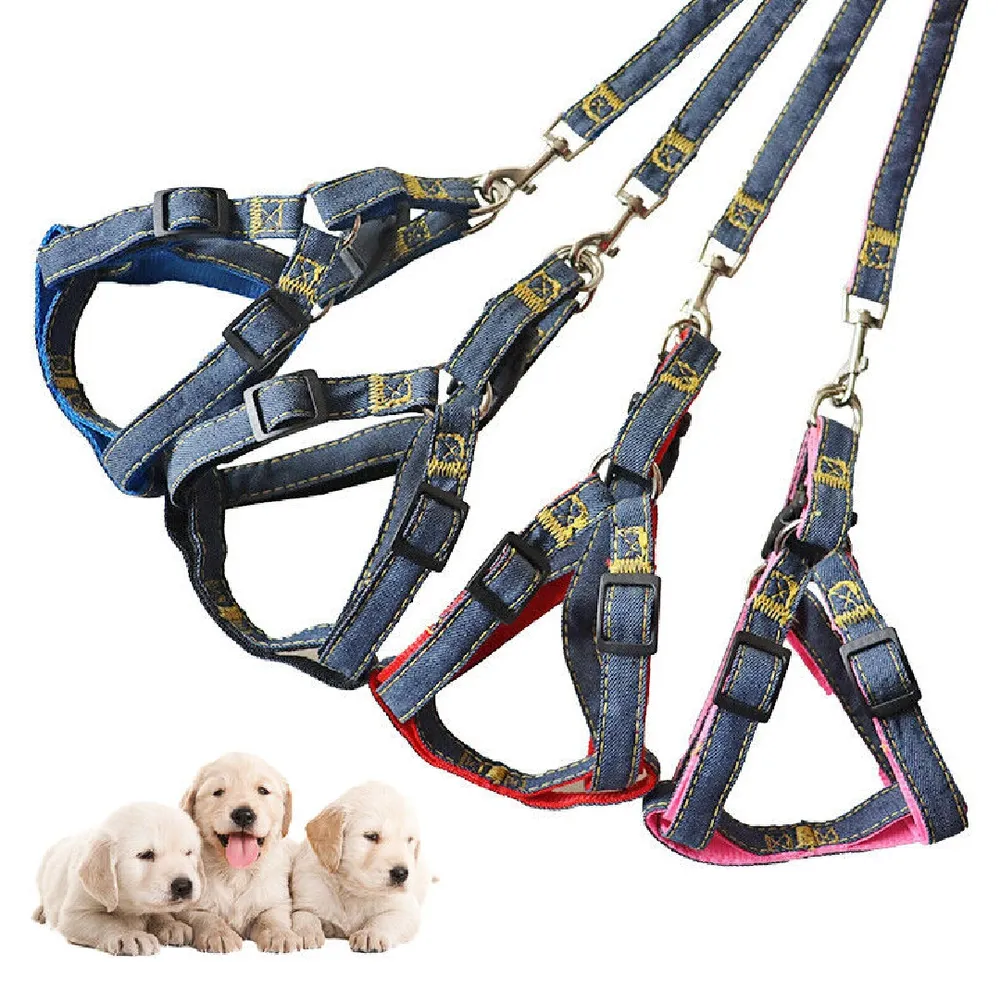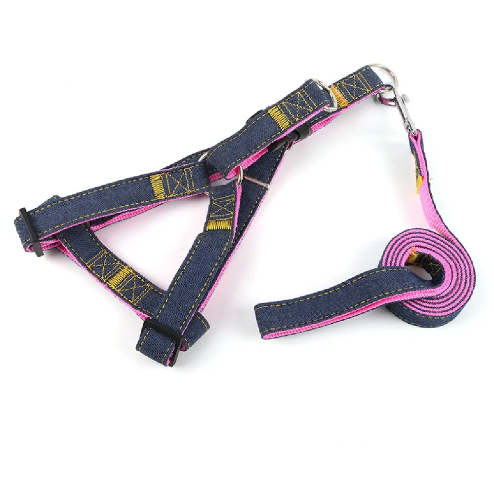 Denim Dog Harness and Leash Set Breathable Step in Dog Vest Outdoor Walking Pet Leash Chest Strap Dog Accessories