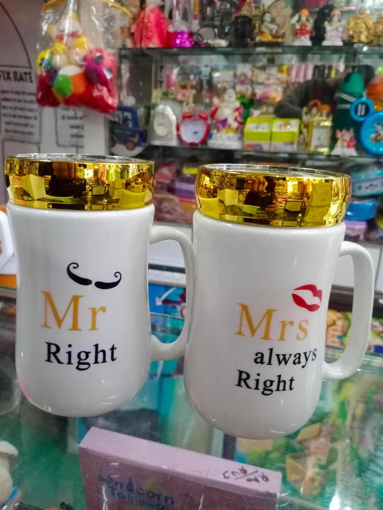 Ceramic Coffee Mug with a Gold Lid Design: It features the humorous phrase "Mrs always Right" in gold lettering, accompanied by a red lipstick kiss mark, on a white ceramic base. ... Read More