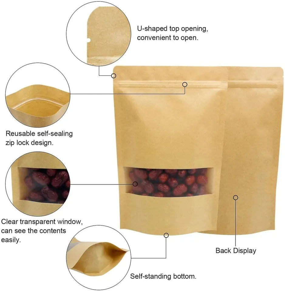 100PCS Brown Kraft Zipper Pouch Bags with Clear Window | Stand-Up Zip Lock Bags for Food, Candy, Spices & Nuts