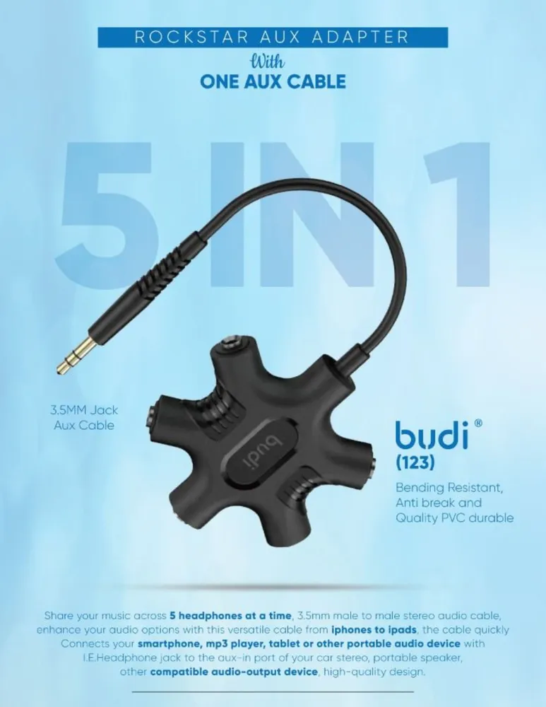 5 in 1 Budi Rockstar Aux Cable, designed for versatility and convenience. This multifunctional audio splitter allows you to connect up to 5 devices at once, making it perfect for sharing music with fr... Read More