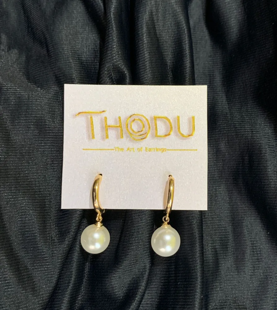 THODU Pearl Drop Earrings feature a round white pearl suspended from a gold or silver plated hoop. Made with high-quality materials for a stylish and timeless look. Light and com... Read More