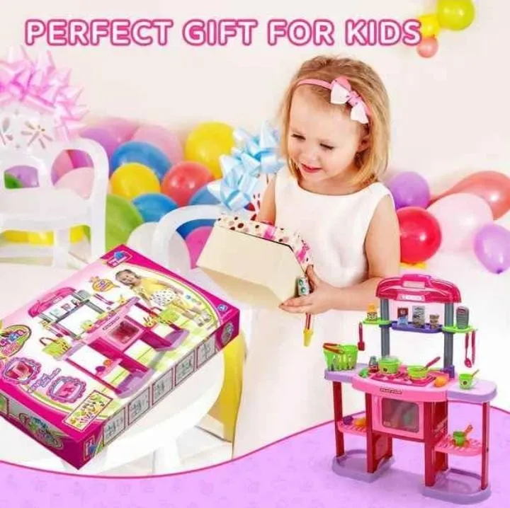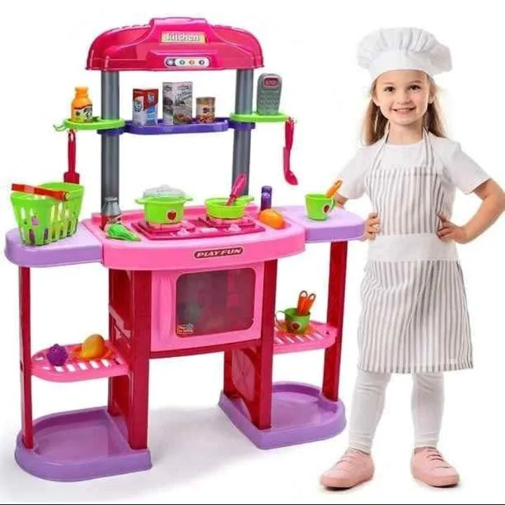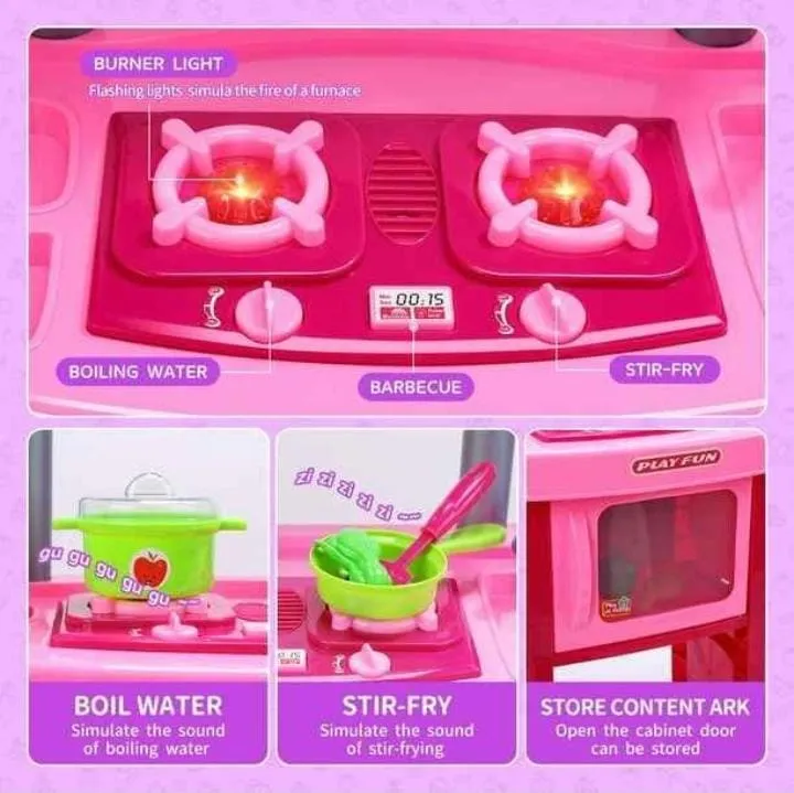 Burners have realistic lights and sound •Temperature Sensing Kitchen Sink Sets •Shelving and pots, pans and accessories •Product Size: 27.1" x 9.43" x 31.6"