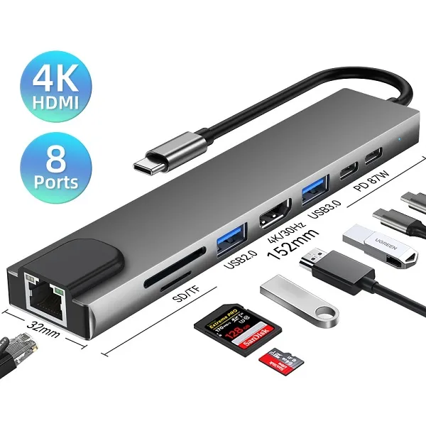 8 in 1 Multiport USB-C Hub Type C To USB 3.0 4K HDMI Adapter
