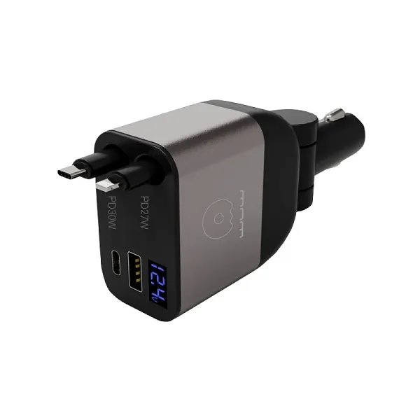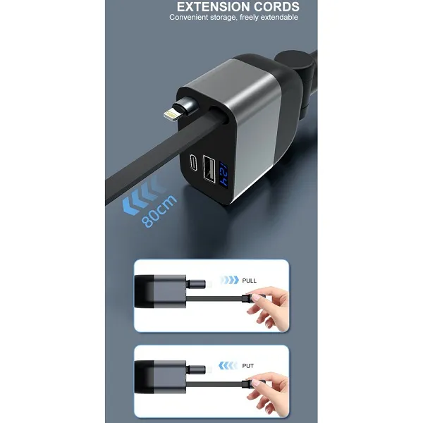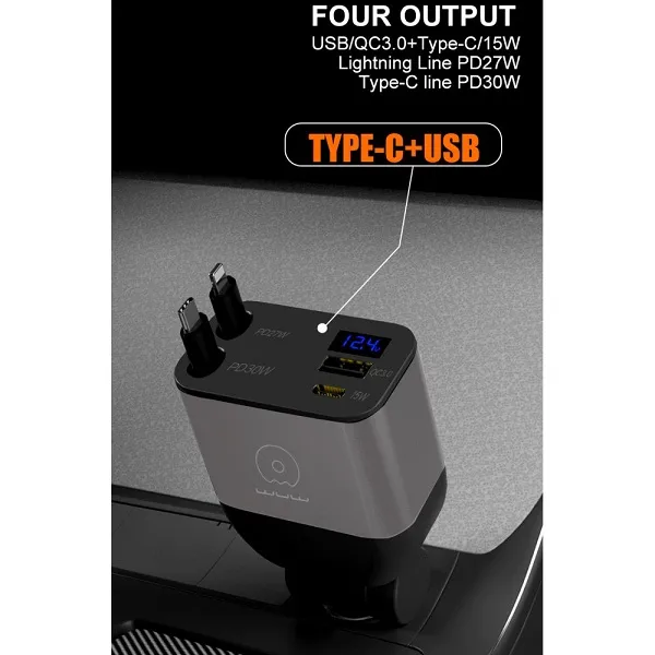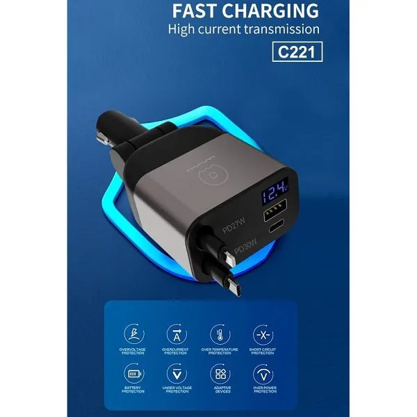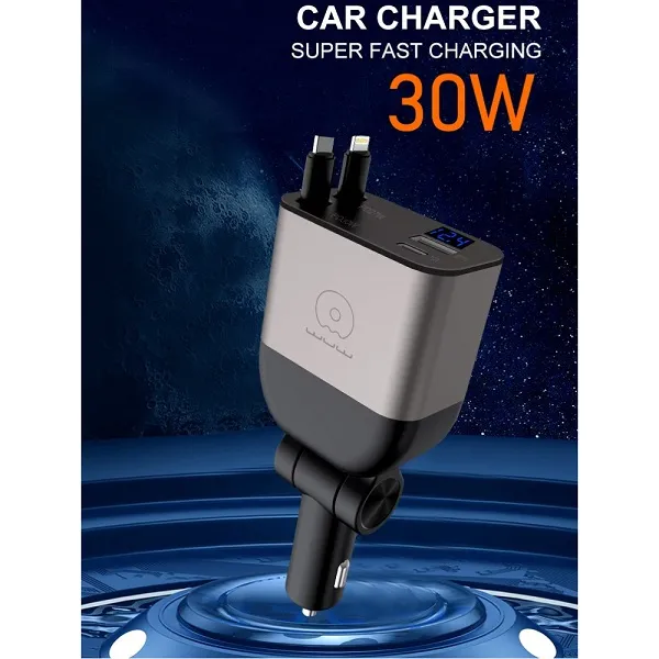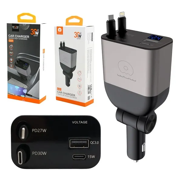 WUW C221 Car Charger+Plug 30W 2 USB & Type-C Ports Type-C Plug Lightning 80cm Strechable Charger WUW C221 PD30W car charger with Lightning, Type-C cable Device type : Automobile Number o... Read More