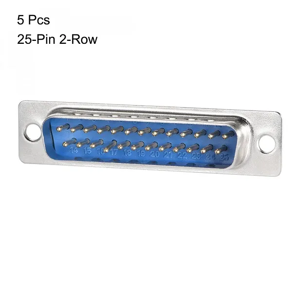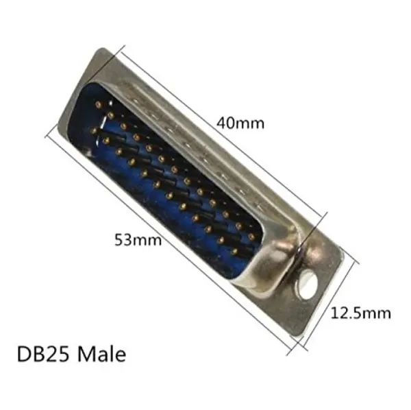 DB25 Male Socket D-Sub RS232 25 Pin 2 Row Solder Type Body Orientation: Straight Material: Plastic , Metal Color: Silver Tone; Blue Gender: Male Pins: 25 PINs Rows: 3 rows
