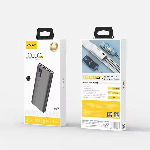 Aspor A335 22.5W 10000mAh Fast Charging Power Bank Product Name: ASPOR A335 Power Bank Brand: ASPOR Model: A335 Battery Capacity: 10000mAh Rated Capacity: 5000mA... Read More
