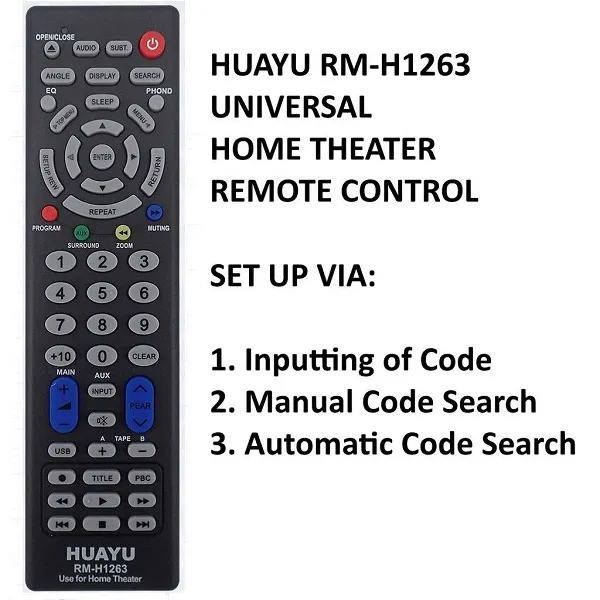 Home Theater Universal DVD BLUE RAY ALL IN 1 Remote Control Huayu RM-H1263+2 All in one Multiple brand Easy to Setup 3 Ways to Set Up Inputting of Codes are Listed in User Manual Manual ... Read More