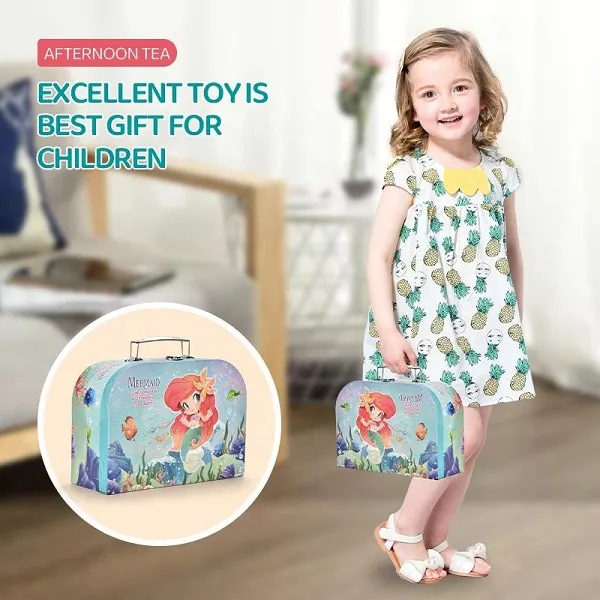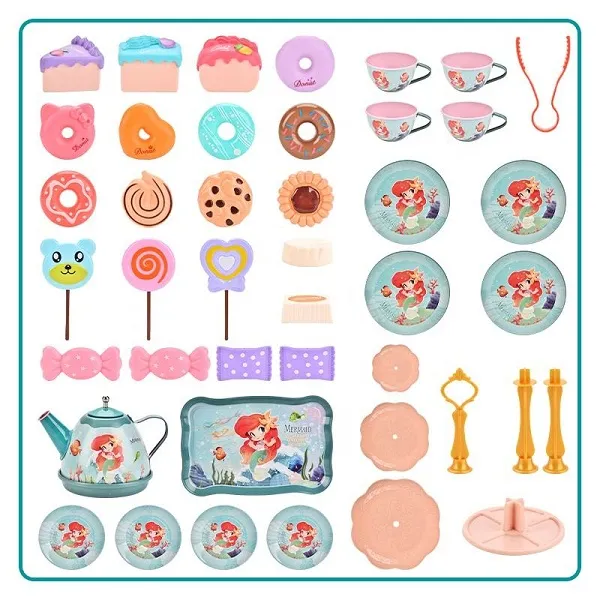 Kids Girls Toy Pretend Play Tin Tea Set Mermaid With Food and Carrying Case 48 Pieces (0642)