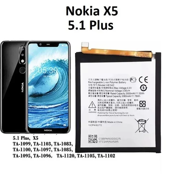 Nokia 5.1 Plus Mobile Phone Battery Compatible Model: Nokia 5.1 Plus Battery Model: HE321 Type: Lithium-ion Rechargeable Battery Capacity: Approximately 3060mAh (may vary by manufacturer) ... Read More