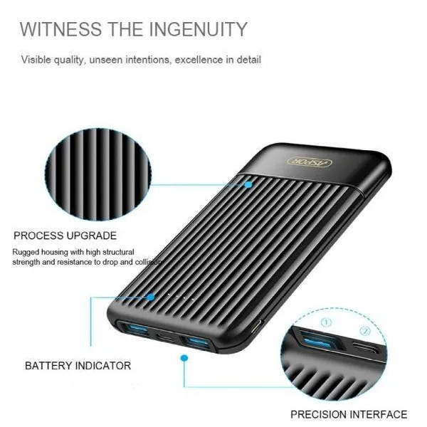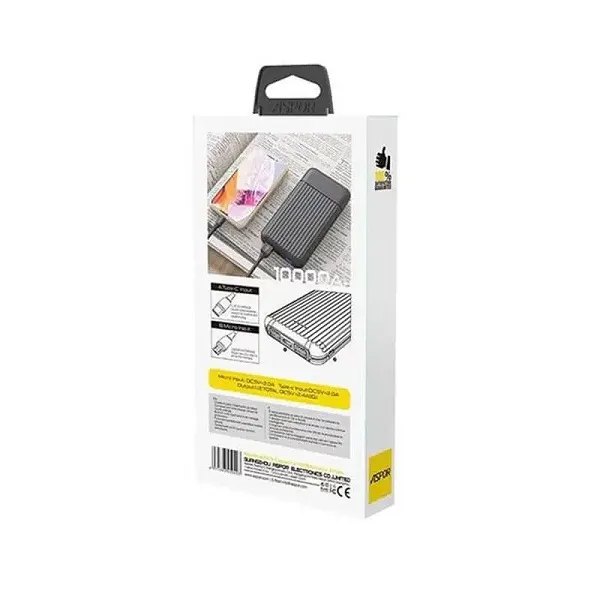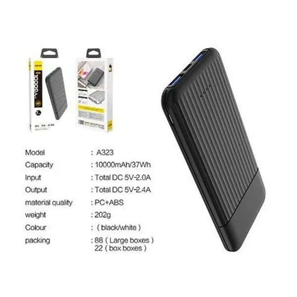 Aspor Portable Power Bank (A323) 10000mAh Battery:10000mah Polymer BATT Dimension: 14cm x 7cm Input 1: 5V/2.0A Input 2: 5V/2.0A Output 1: 5V/2.0A Output 2: 5V/2.0A Weight: 217g ... Read More