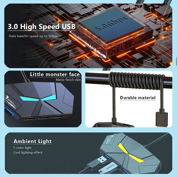 RGB 4 Port USB C Hub 3.0 USB Splitter USB Extender