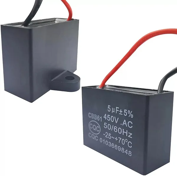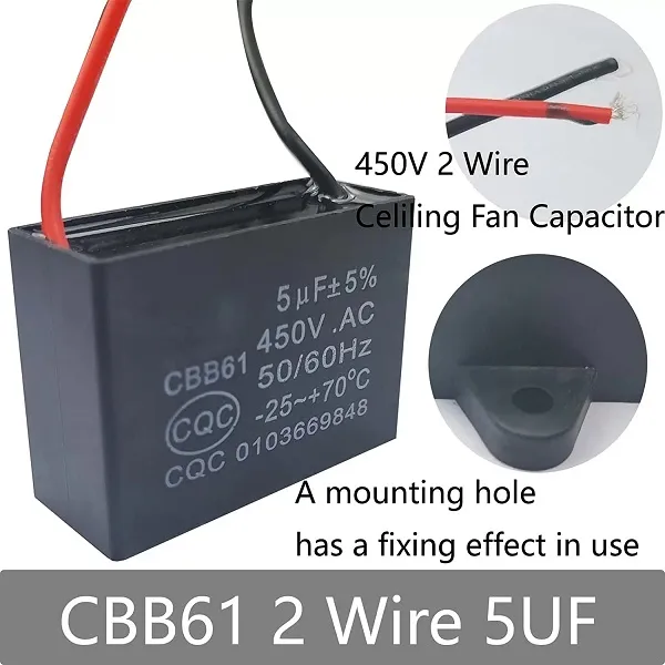 Stand Wall Fan 2 Wire Capacitor 5.0uF Model: CBB61 Capacitance:5uF Shell Material: Plastic Color: Black Size: 38X27X15 (LxHxW) in mm Rated Voltage: 450V AC Frequency: 50 / 60Hz Tol... Read More