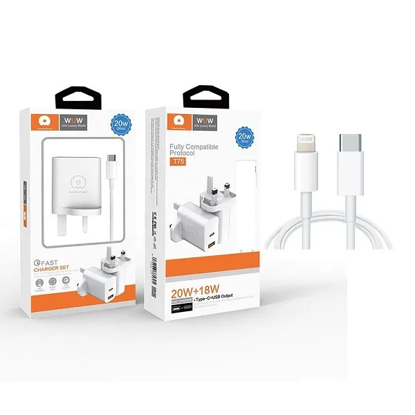 WUW T75 20W Type C+18W USB Fast Charging Output with Type C to Lightning Cable Charger Designed for convenience and performance, this adapter combines a sleek design with powerful capabilities t... Read More