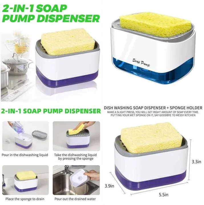 2 in 1 Countertop Dish Washing Liquid Soap Dispenser Pump with Sponge Holder Sink Caddy Organizer