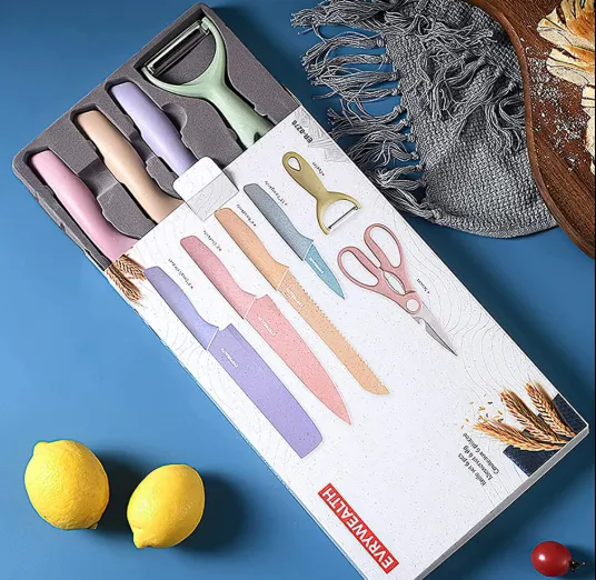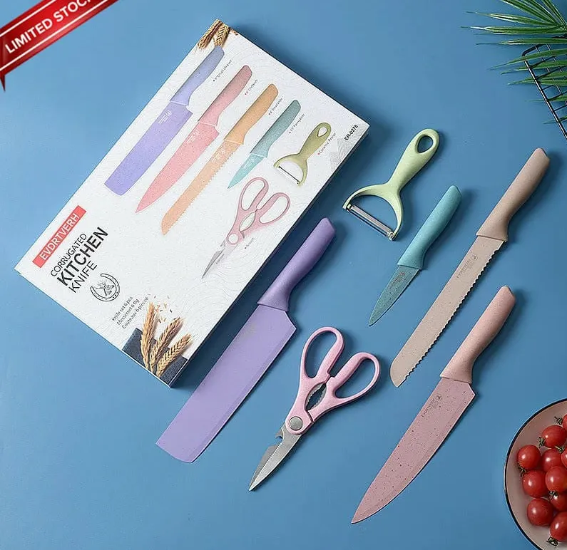 Colorful Kitchen Knife Set 6 PCS Non Stick Coating Chef Boxed Knives for Cooking Camping Travel Picnic BBQ and RV