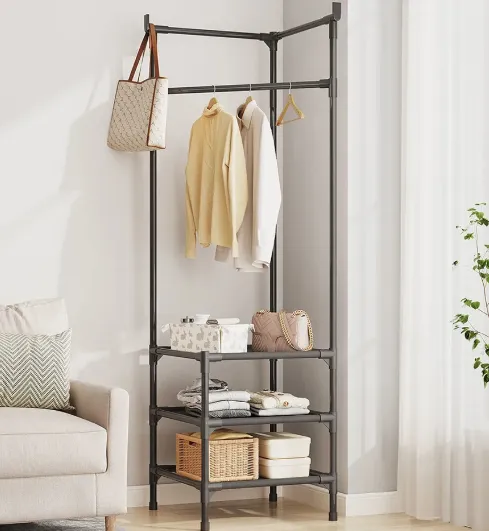 Multi Function Corner Coat Rack Floor Standing Clothes Hanger with Storage Shelves