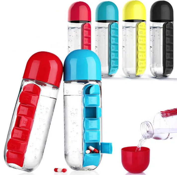 Pill Organizer Water Bottle Pill Vitamin Water Bottle Tablet Holder Medicine Pill Box Organizer Bottle with Removable 7 Days Pill Compartments Capsule