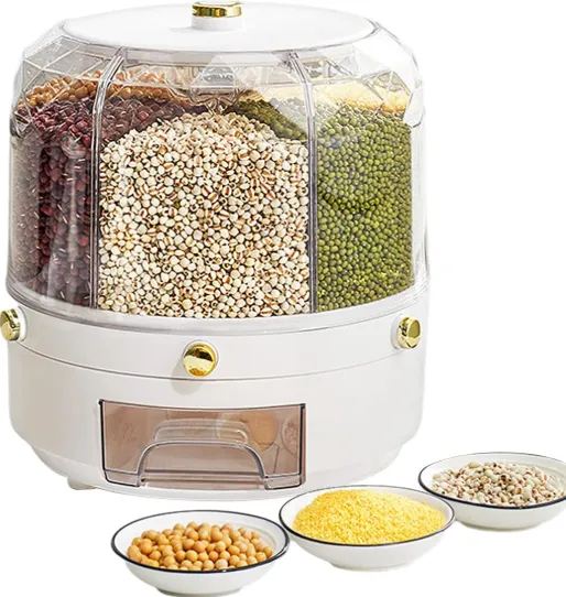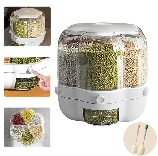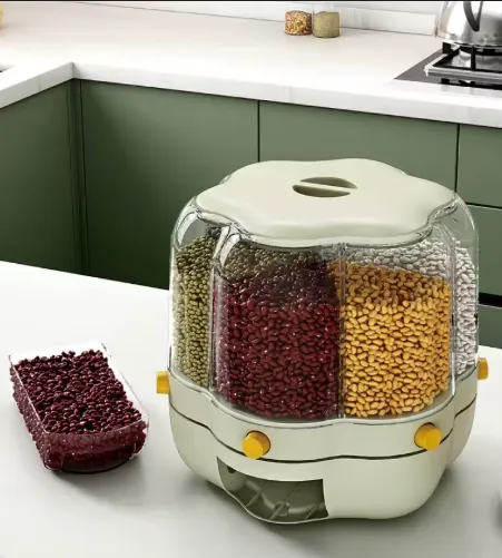 Rotating Grain Dispenser – Multi-Grid Dry Food Storage Container with Measuring Cup for Kitchen Organization
